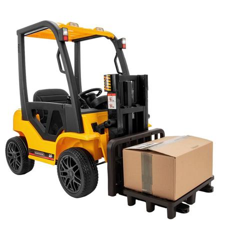 Elektrický vysokozdvižný vozík pro děti od 3 do 8 let. Baterie 12 V/10 Ah, 2x 45W motor. Přesouvání nákladu pomocí paletové plošiny. Dálkový ovladač pro rodiče. Nosnost vozítka 30 kg